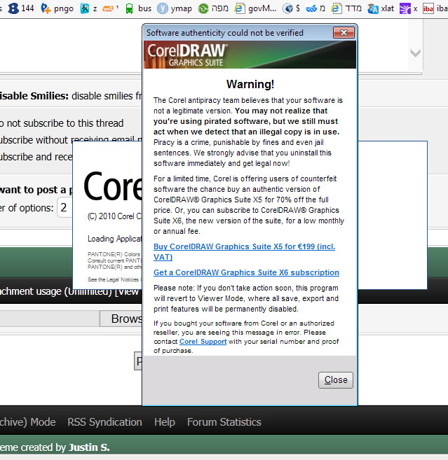 I just spoke with 2010kaiser and he passed me this screenshot of an install of his torrent of Corel Draw X5 done a few mins ago. He recommends a fresh install and to make sure you block the application with inbound/outbound rules in you firewall. Also NEVER EVER allow Corel to update: