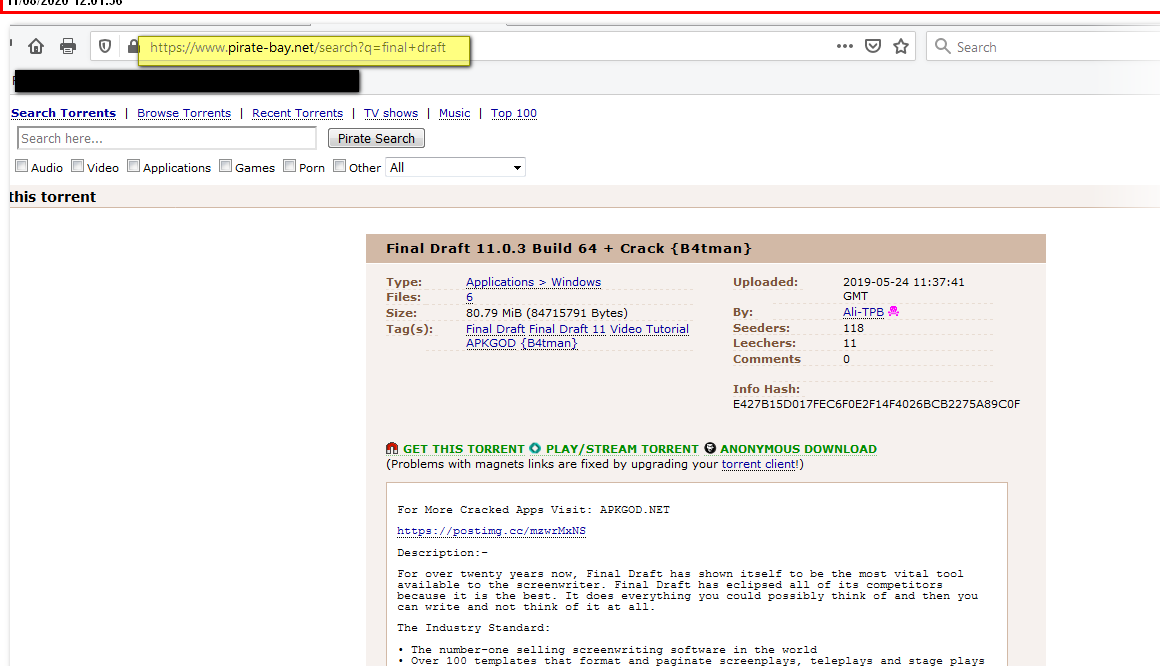 https://www.pirate-bay.net/search?q=final+draft is the only URL when i am on the Final Draft 11.0.3 Build 64 + Crack {B4tman} torrent