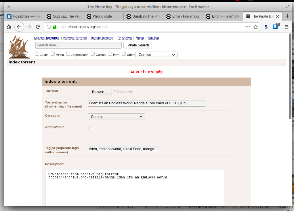 i use Tor with https and with onion and every time i got this (when try to upload torrent) error - File Empty, cant upload torrents .......
